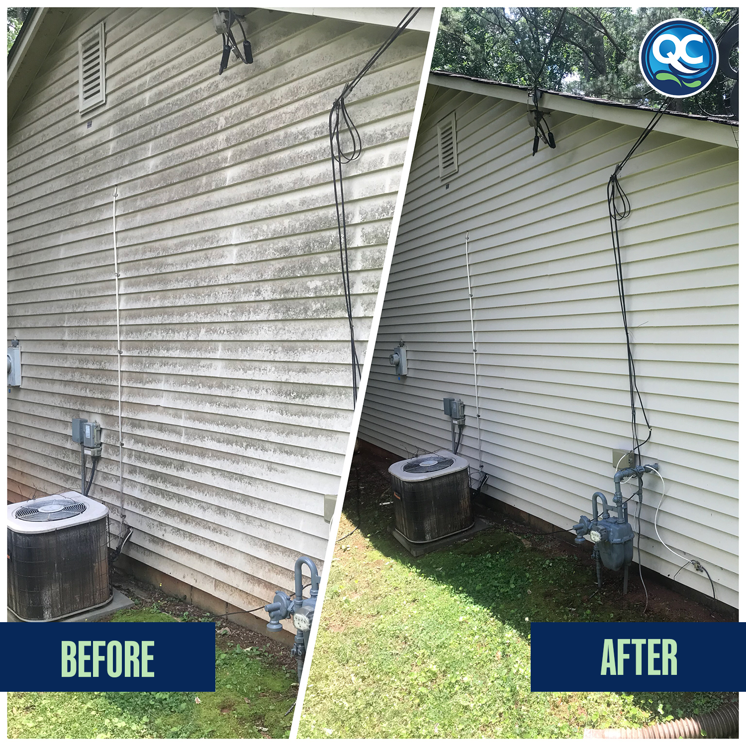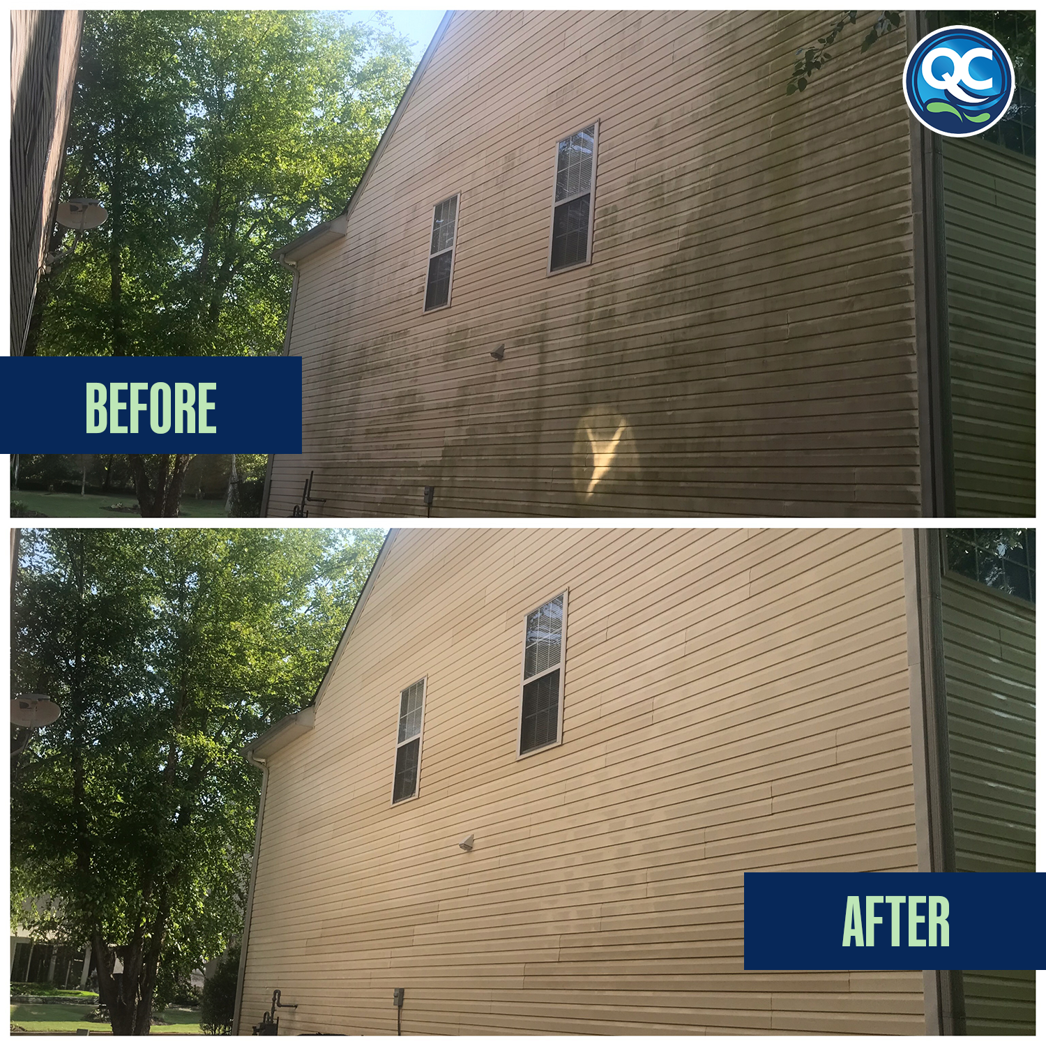 At Quick and Clean, we never use high-pressure blasting on vinyl siding. Instead, we use a professional soft washing system that combines low-pressure water with biodegradable cleaning solutions.